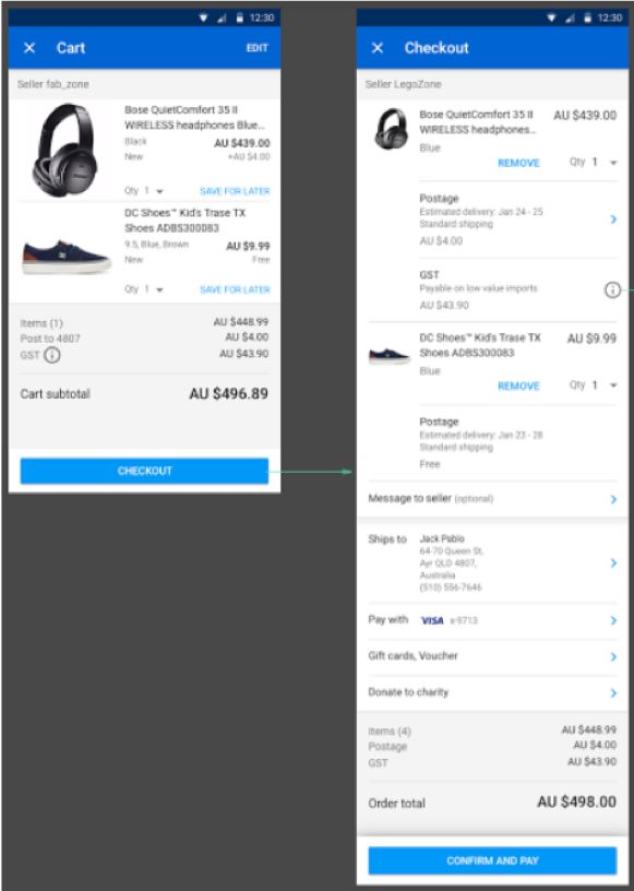 在结账页面,用户会看到额外的10%商品及服务税已经添加到相应的订单上了(仅限于下述三个条件都满足的订单:订单总金额小于或等于1000澳币、物品所在地不在澳大利亚,且收件人地址在澳大利亚),如下图所示: